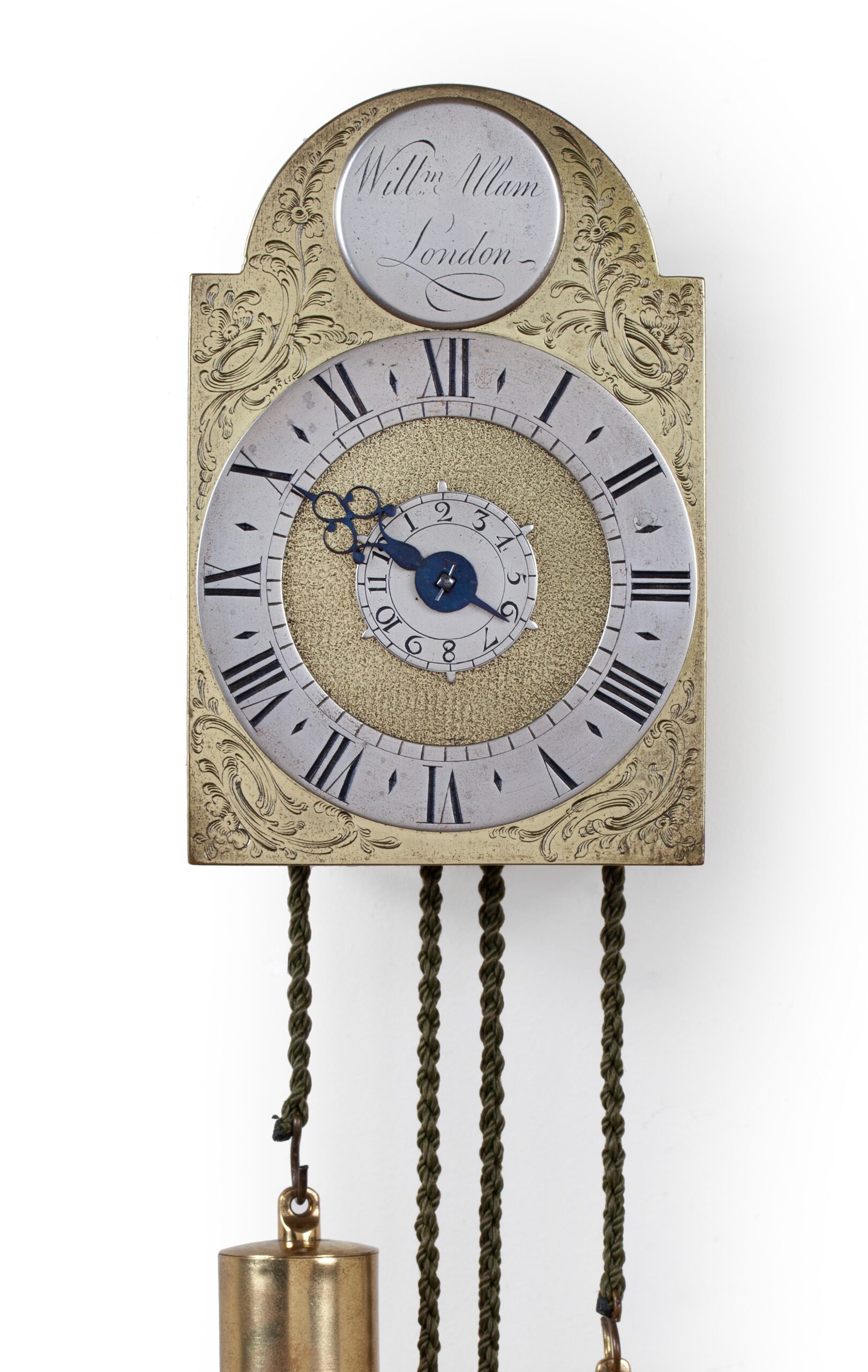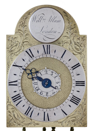 The arched brass dial has a silvered brass chapter ring with Roman hour numerals, as well as half-hour and quarter-hour divisions. In the arch is a silvered circular plague with the engraved signature of the maker: Will.m. Allam London. There are engravings depicting leafy vines and scrolls around this plaque and the chapter ring. Behind the hand is a silvered alarm disc with Arabic hour numerals and half-hour divisions. The time is indicated by a single pierced blued steel hand. The alarm time is shown on the alarm disc by the tail of the hand.