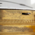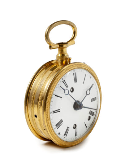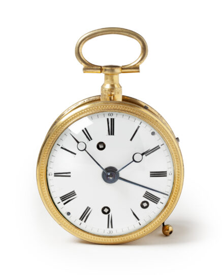 The round case is made of gilded brass. A beautiful guilloché brass gilded bezel ring is fitted around the dial. The whole is crowned by a profiled brass suspension eye. On the side there is a small lever to operate striking (Sonata) or not striking (non Sonata).