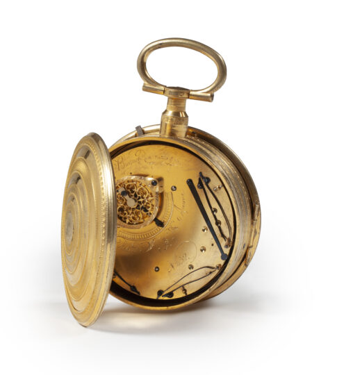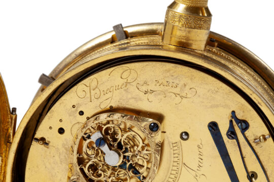 Abraham Louis Breguet was born in 1747 in Neuchatel (Switzerland). From 1762 to 1767 he was apprenticed to the watchmaker’s training, probably in Versailles with Lépine and/or Berthoud. In 1768 he emigrated to Paris with his parents and sisters. In the evenings he studied mathematics at the Collège Mazarin. In 1775 he married Cécile Marie Louise L’Huillier (born in 1752). In that year the couple started a business at Quai d’Horloge 51, now no. 79, near Pont Neuf, in the middle of the watchmaking district. This can be called the founding year of the house “Breguet”. He associated himself from 1787 to 1791 with Xavier Gide, a watch dealer in Paris. On 12 August 1793 Breguet repatriated with his wife and son Louis Antoine to Switzerland, fleeing the revolution, first to Geneva, then to Neuchatel and finally to Le Locle. On 10 April 1795 they returned to Paris and settled in 1796 at the old address on the Quai d’Horloge. The years that followed until his death in 1823 were the most fruitful of his life. In 1807 his son Antoine joined the business. His son had received part of his training from John Arnold in London. He made several inventions, including the Breguet winding key, several improvements in the escapement of watches, the ‘monter perpétuelle’, the Tourbillion, the ‘pendule sympathique’, the ‘montres à tact’, also called ‘monter aveugle’ and the ‘heures sautantes’. He died on 3 September 1823 in Paris.