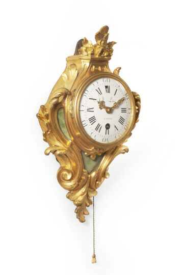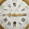 The round white enamel dial has black enamelled Roman numerals for the hour-indication and Arabic numerals for the 5-minute indication. Above the XII the movement can be regulated. On the case, below the 30, is a pendulum aperture, to set the pendulum and view its action. The dial is signed Gille l’Aîné A Paris. The two pierced L. XV hands are made of gilt brass.