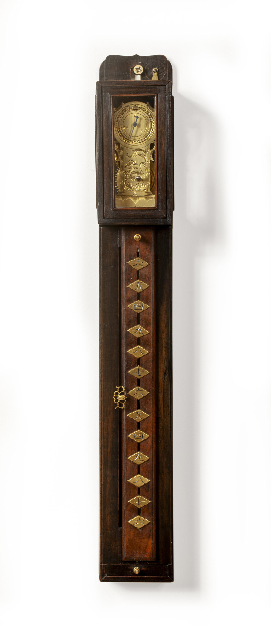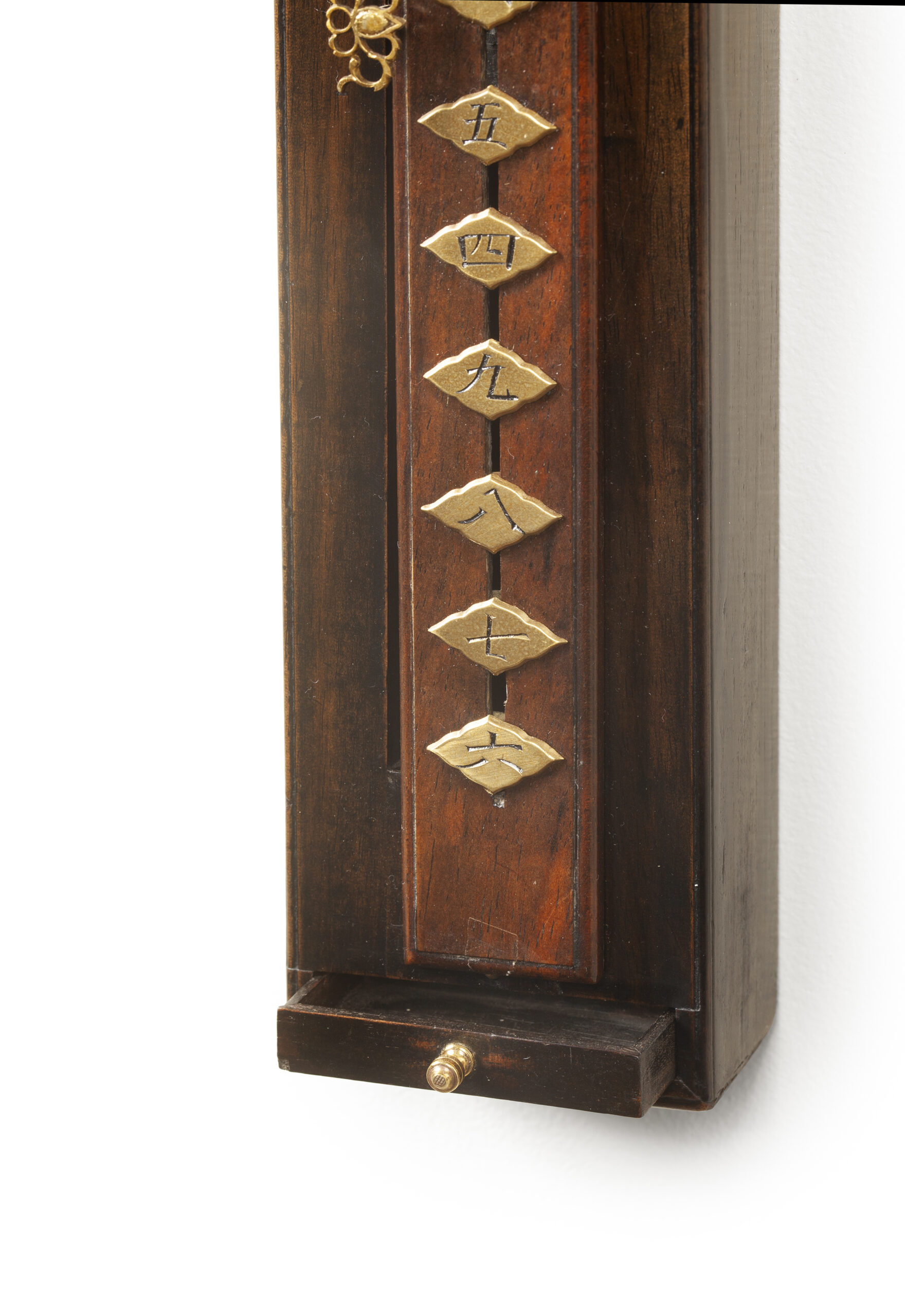 The wooden dial has 13 movable brass hour ‘tokis’. These are engraved and filled with black wax to depict the hours. The Japanese characters on the tokis represent the following numerals from top to bottom: 6, 5, 4, 9, 8, 7, 6, 5, 4, 9, 8, 7, 6. The decoratively pierced brass hand moves down to the left of the tokis.