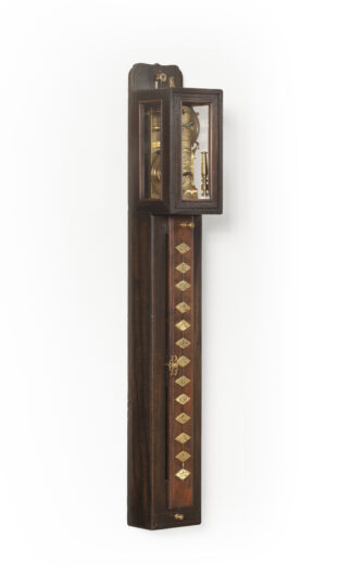 The brass movement has a going train with verge escapement and balance wheel. The lovely brass front plate has on top an indication ring with a blue steel hand, surrounded by a laurel wreath and below engraved chrysanthemum motifs. The winding arbor for the going train is also positioned here. The movement is mounted by a brass frame. The going train is driven by a weight.