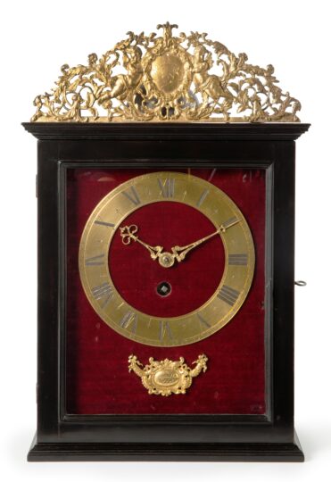 The ebonised pearwood-veneered walnut case of this religieuse has an elaborately pierced gilt cast brass pediment behind which the bell is situated. In this pediment two cherubs hold a coat of arms between them. There are glazed windows to the sides through which the movement is visible, whilst at the back there is a door giving access to the movement. The case has mouldings all around