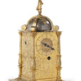 This brass fire gilt case is engraved with floral decorations. Beneath the dial he case is punchmarked by the stamp of the city of Bamberg. The corners are decorated with columns. The striking indicator dial at the back side with engraved Arabic numerals and a blued steel hand. The bell is placed on top of the case covered by a brass fire gilt engraved dome and crowned by a figure. At the front is a small slide to set the alarm on – off.