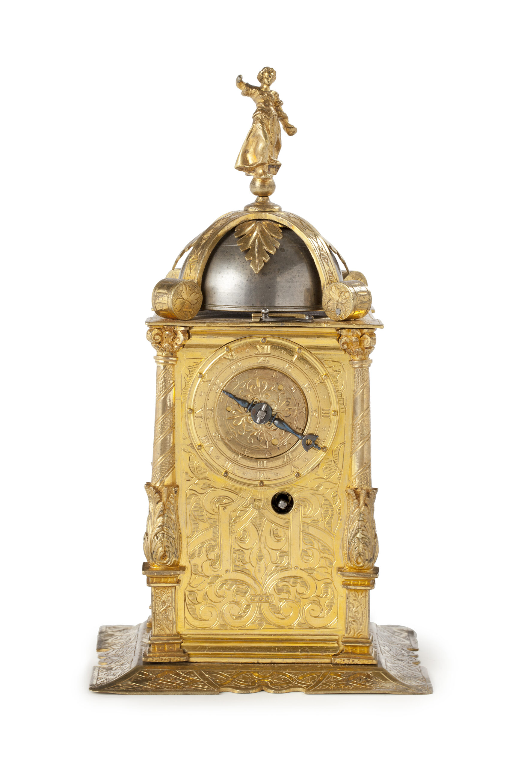 The round brass fire gilt dial-plate with touch knobs. The outer ring with Roman numerals I-XII for the hours and the inner ring with Arabic hour numerals 13-24. The hour pierced hand is made of blued steel. In the center of the dial plate the brass fire gilt alarm disc with engraved Arabic numerals and engraved scrolling foliage.