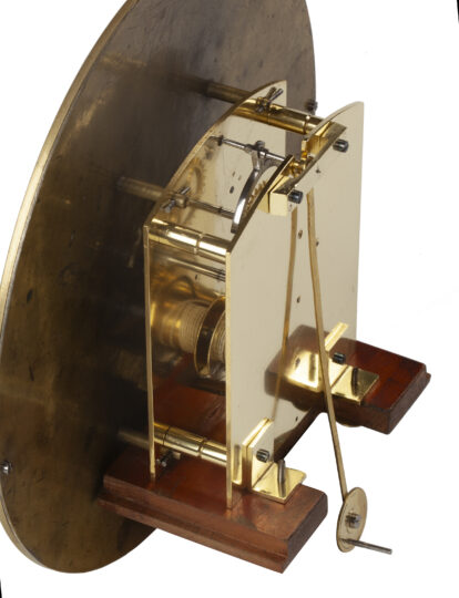 The brass movement is constructed between two plates and has a going train only. It has an anchor escapement and an ebonised wooden pendulum with a prominent brass bob and is driven by a brass weight via a pulley. It is wound from the front. As usual with these types of wall clocks, the weight is suspended in front of the pendulum.
